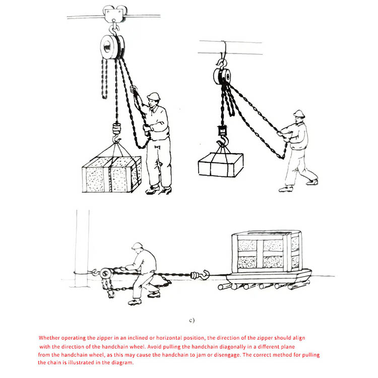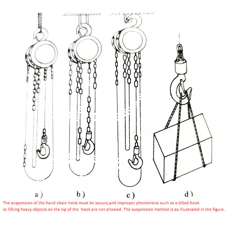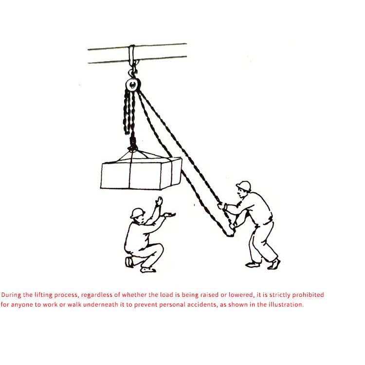 Avertissement spécial : en cas de blocage de la chaîne, de défaillance des freins ou d'autres anomalies, arrêtez immédiatement d'utiliser le palan et faites-le inspecter par un professionnel. La sécurité est primordiale ; un bon fonctionnement protège à la fois l’équipement et, plus important encore, des vies.